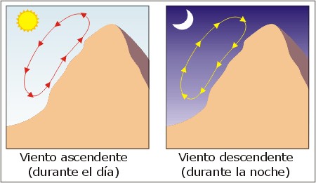 Las regiones montañosas muestran modelos de clima muy interesantes. Un ejemplo es el viento del valle o vientos de ladera, que se origina en las laderas montañosas que dan al sur (o en las que dan al norte en el hemisferio sur). Cuando las laderas y el aire próximo a ellas están calientes (lo que ocurre durante el día), la densidad del aire disminuye, y el aire asciende hasta la cima siguiendo la superficie de la ladera. Durante la noche la dirección del viento se invierte, convirtiéndose en un viento que fluye ladera abajo. La figura lo muestra:
