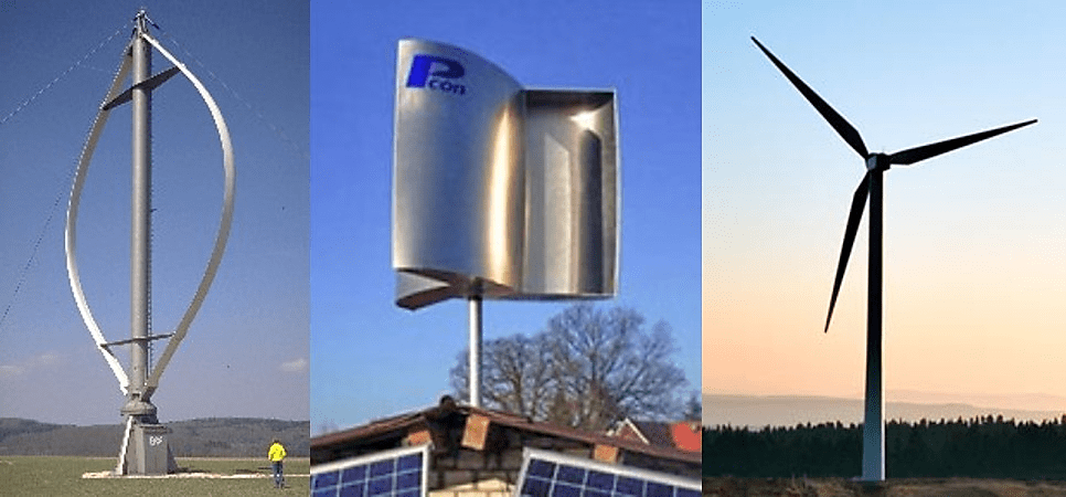 Izquierda: turbina Darrieus (fuente de la imagen: Renovable Energy UK). Centro: turbina Savonius (fuente de la imagen: Netzeroguide.com). Derecha: turbina tripala de eje horizontal (fuente de la imagen:Top-alternative-energy-sources.com)
