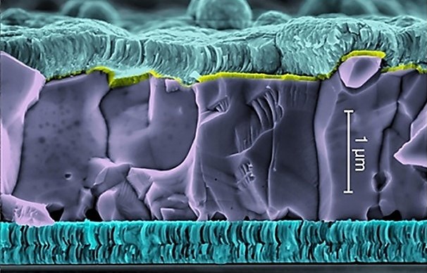 Sección transversal de una célula CIGS fabricada en uno de los centros de investigación líderes de esta tecnología, el ZSW (Zentrum für Sonnenenergie- und Wasserstoff-Forschung Baden-Württemberg; Centro de Investigación en Energía Solar e Hidrógeno de Baden-Würtemberg). Se aprecia la estructura irregular de las diversas zonas, debido a la naturaleza policristalina de los diferentes materiales integrantes.