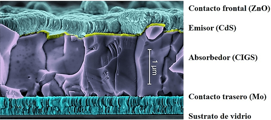 La estructura de estos dispositivos presenta muchas analogías con las células de Si, ya que esencialmente, son dispositivos de unión entre dos semiconductores: un emisor a través del cual se ilumina y una base que es donde se absorbe la práctica totalidad de la radiación solar; pero también tiene diferencias significativas con las primeras, que están relacionadas con los materiales empleados para fabricarlas; el emisor y la base de las células de silicio son de silicio, mientras que en las células de CdTe y CIGS, el emisor se suele hacer de una unión compleja de dos semiconductores de gap elevado CdS/ZnO, siendo el absorbedor de CdTe o CIGS. Además, las tecnologías de fabricación empleadas dan lugar a materiales policristalinos. La imagen muestra un corte transversal de un dispositivo de CIGS, tomada con microscopía electrónica de barrido, en la que se han coloreado las diversas zonas del dispositivo para distinguir bien sus integrantes: