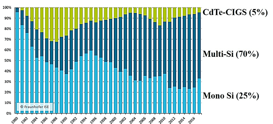 Evolución anual del reparto por tecnologías (en %) del mercado fotovoltaico desde 1980 hasta el presente. Multi-Si (silicio multicristalino), mono-Si (silicio monocristalino). “Thin film” (CdTe y CIGS). Fuente: Fraunhofer Institute for Solar Energy Systems, Photovoltaic Report, 27-agosto-2018