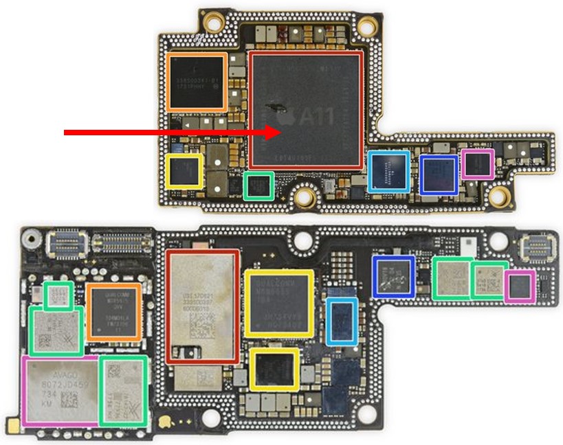 Anverso y reverso de la placa base del iPhone X. Cada uno de los cuadrados bordeados de color es un circuito integrado, todos llevan en su interior cientos de millones de transistores MOSFET y en algún caso miles de millones, como en el señalado en la imagen, el procesador Apple A11 Bionic, que tiene 4.300 millones, de un tamaño de decenas de nanómetros cada uno de ellos [1].