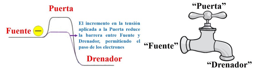 El funcionamiento descrito en el párrafo anterior se puede asimilar al de un grifo de agua, tal y como muestra la figura anterior: el agua que circula por una tubería (Fuente) sale hacia la boca del grifo (Drenador) a través de una llave (Puerta) que abre o cierra el flujo de agua, controlando su caudal. En el transistor, el agua es la corriente eléctrica y la llave de paso que gobierna su funcionamiento, la Puerta. El siguiente vídeo muestra las ideas expuestas en este párrafo: