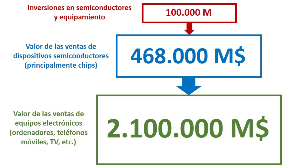 La penetración masiva de la Microelectrónica en los mercados de consumo, comunicación y automoción se puede concretar en unas cifras verdaderamente apabullantes: en 2018, con una inversión mundial de 100.000 millones de dólares en materiales semiconductores y equipos para fabricación de chips, la industria del ramo generó 468.000 millones de dólares en ventas de estos dispositivos, principalmente circuitos integrados, que se utilizaron para incorporar en productos y tecnologías que funcionan gracias a ellos: ordenadores, teléfonos móviles, televisores, radar, robótica, programación,…El mercado global de la electrónica generó ventas por un valor superior a 1.6 billones de dólares: