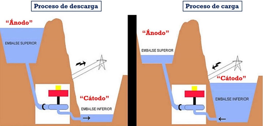 Símil entre una central hidroeléctrica reversible y una batería recargable indicando como tienen lugar los procesos de carga y descarga de la batería y sus equivalentes en el caso de la central reversible