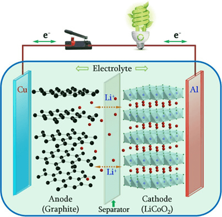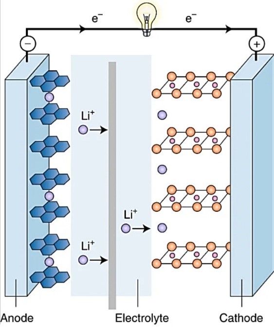 La figura ilustra el proceso de descarga de una batería de ion-litio, durante el cual los iones de litio (Li+) se desplazan desde el cátodo de grafito hacia el ánodo de LiCoO2, mientras que los electrones se mueven a través del circuito exterior, también desde el ánodo hacia el cátodo, alumbrando la bombilla. La fuente de la imagen está tomada de un trabajo de John B. Goodenough, uno de los galardonados este año con el Premio Nobel de Química: “How we made the Li-ion rechargeable battery”, Nature Electronics 1, 204 (2018)