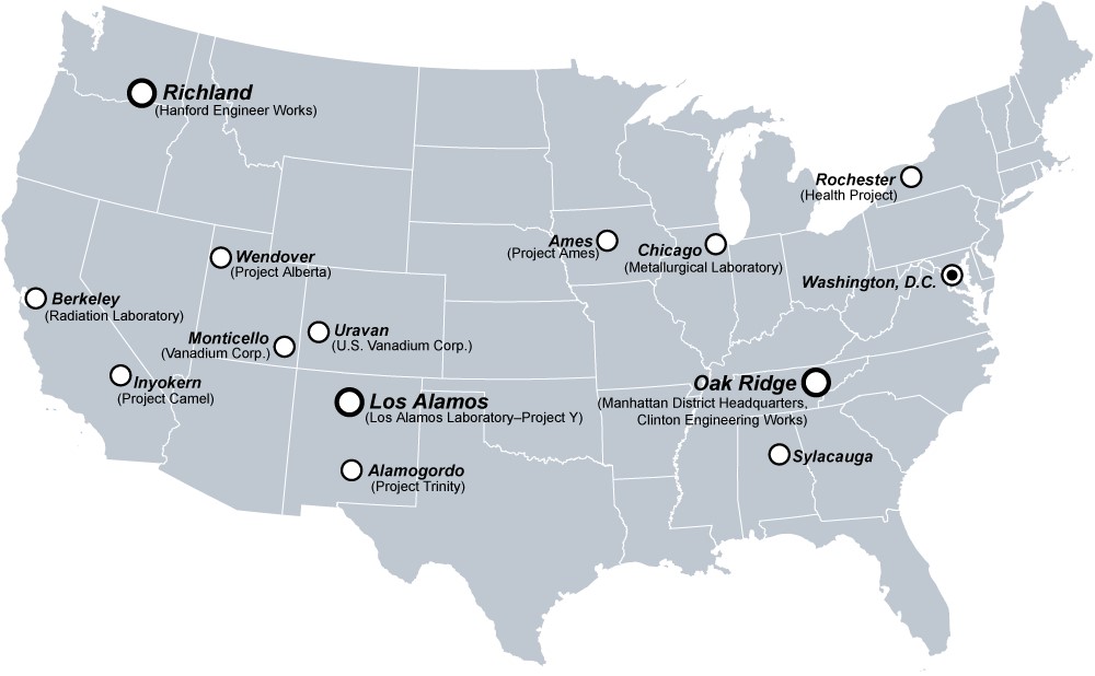 La red de laboratorios y empresas implicadas en la obtención de la bomba era enorme y no se limitaba al recinto de Los Álamos. El Proyecto Manhattan fue creciendo progresivamente hasta tener más de 130.000 empleados, con un coste total del Proyecto cercano a los 1.900 millones de dólares de la época (unos 29.000 millones de 2020). La investigación y producción se llevaron a cabo en más de 30 lugares repartidos por todos los Estados Unidos, Reino Unido y Canadá. El siguiente mapa muestra la ubicación de los principales centros implicados en los EEUU: