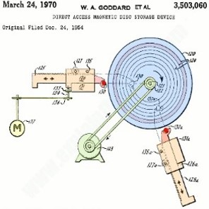 El desarrollo y evolución posterior de esta idea original del HD, como muchas otras innovaciones relacionadas con los ordenadores, se llevó a cabo en la compañía IBM a lo largo de la década de 1950. El fruto más destacado de ese ingente trabajo se obtuvo en 1970, con la patente del HD que ha equipado durante decenas de años los PC y siguen equipándolos en la actualidad -Patente US 3503060; William A. Goddard y John J. Lynott “Direct access magnetic disc storage device”-; la figura muestra la imagen clave de dicha patente: