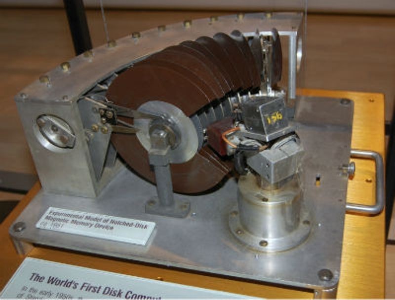 El concepto y las ideas presentes en esta patente ya se habían utilizado por IBM años antes, cuando en septiembre de 1956 la compañía introdujo en el mercado un nuevo modelo de ordenador: el IBM 305 RAMAC (Random Access Memory Accounting). Este ordenador fue uno de los últimos en emplear válvulas de vacío como elementos de cálculo con lo que, por esta parte, no significó nada nuevo, pero fue el primer ordenador del mundo dotado con una unidad de memoria de disco duro magnético. El elemento esencial de la máquina era esa unidad, el IBM 350 Disk Storage, gracias al cual el ordenador se convirtió en un éxito en el mercado y se construyeron más de 1.000 equipos de este modelo antes de que finalizara la producción en 1961.