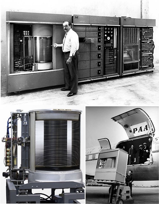 Arriba: IBM 305 RAMAC, con el operador mostrando la unidad de memoria, la 350 Disk Storage. Abajo izquierda: detalle de la unidad de memoria. Abajo derecha: una memoria 350 Disk Storage embalándose en un avión para su transporte