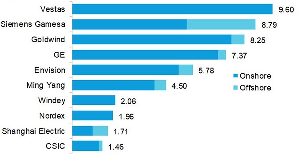 Los fabricantes entregaron casi 61GW de turbinas eólicas a escala mundial en 2019, en comparación con los 50 GW del año 2018. La mayoría de estas se instalaron en tierra (88%), pero la proporción de turbinas instaladas en alta mar ha crecido cuatro puntos y ya suponen el 12% del mercado. Los cuatro mayores fabricantes representan el 55% del total de turbinas instaladas y fueron, por orden, los siguientes: la danesa Vestas, la española-alemana Siemens Gamesa, la china Goldwind y la estadounidense General Electric: