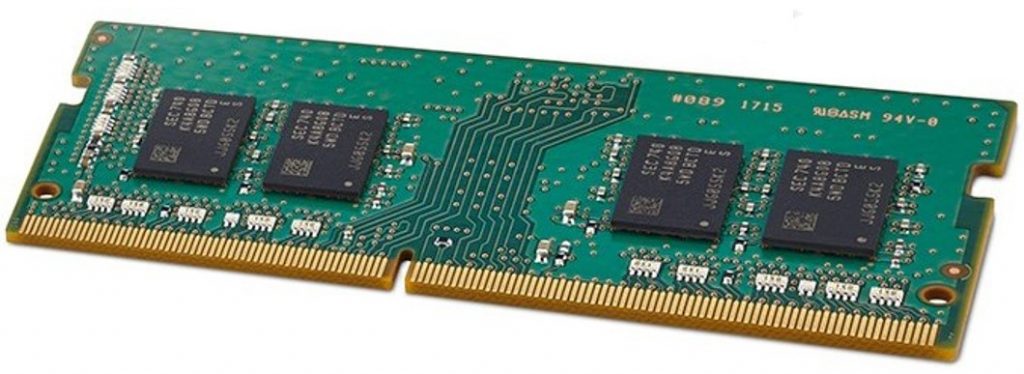 Chips de una memoria RAM de 8 Gb fabricados por Samsung en tecnología de 10 nm insertados en una tarjeta de memoria de un ordenador personal