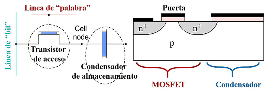 Izquierda: esquema de una unidad de memoria RAM, constituida por un transistor MOSFET (“Transistor de acceso”) y un condensador de almacenamiento del bit. Derecha: sección transversal esquemática del dispositivo en un circuito integrado. Ver el texto para entender el detalle del funcionamiento
