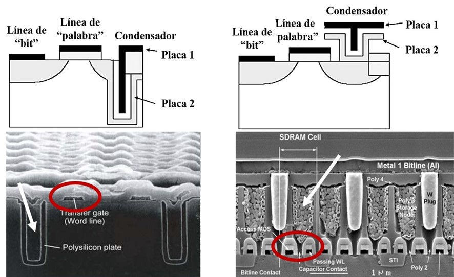 Arriba: corte transversal esquemático de una unidad RAM con condensador de zanja (izquierda) y con condensador apilado (derecha). Abajo izquierda: Imagen tomada mediante microscopía electrónica de barrido de un corte transversal de una unidad de memoria RAM con condensador de zanja. Abajo Derecha: con condensador apilado. En círculo rojo, el transistor MOSFET que actúa como llave de paso de los paquetes de electrones hacia o desde el condensador, que está señalado en ambos casos con una flecha.
