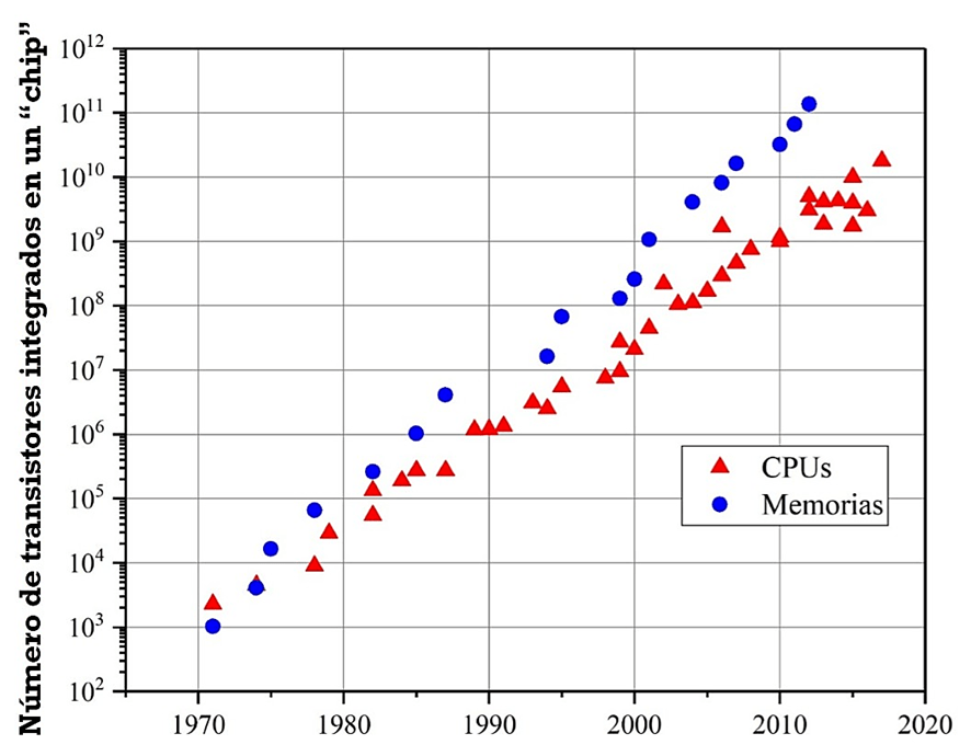 La potencia, la rapidez y en general, las posibilidades que ofrecen los ordenadores modernos han mejorado espectacularmente durante los últimos 30 años gracias a los no menos espectaculares avances de la tecnología microelectrónica, lo que ha permitido duplicar el número de transistores integrados en un chip cada dos años aproximadamente, lo que se conoce como la Ley de Moore. La siguiente figura muestra la evolución de la Ley de Moore para los procesadores (las CPU’s) y para las memorias RAM: