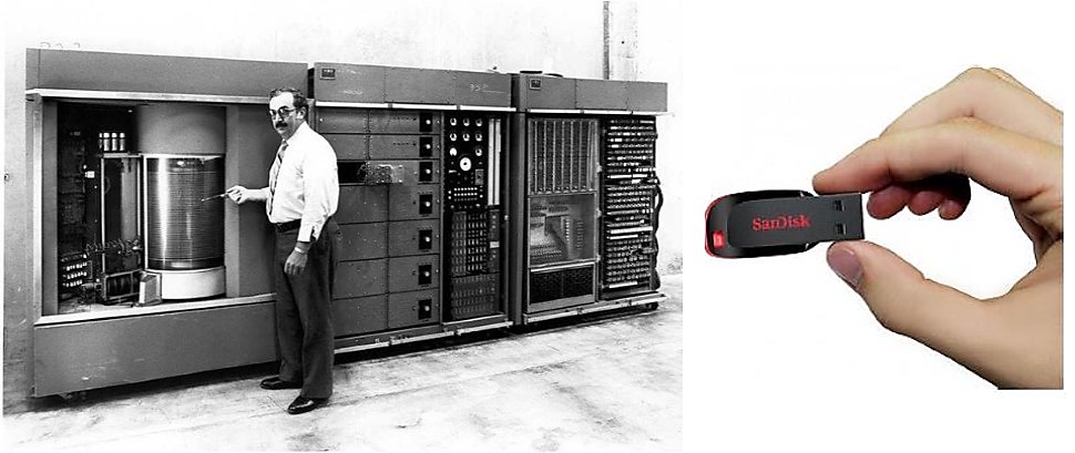 Comparando los tamaños de dos unidades de memoria. Izquierda: la primera unidad de almacenamiento magnético, la RAMAC 205 de IBM. Como ya vimos en otro artículo de esta serie, se dio a conocer en 1956 y era capaz de almacenar 5 MB. Derecha: un “pen-drive” actual de Scan Disk, con una capacidad de 64 GB