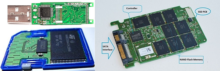 En el interior de tres dispositivos de almacenamiento basados en las memorias Flash: Pen-drive, tarjeta SD y disco duro de estado sólido (SSD)