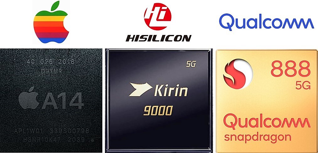 De izquierda a derecha, Apple A14 Bionic (fabricado por TSMC, que equipará el iPhone 12), HiSilicon Kirin 9000 (también fabricado por TSMC, para el Huawei Mate 40) y Qualcomm Snapdragon 888 (fabricado por Samsung, que irá dentro del Xiaomi Mi 11). Los tres tienen tamaños similares. Ninguna de las tres empresas que los han diseñado los fabrican, los tres son lo que se denomina en el sector “fabless”
