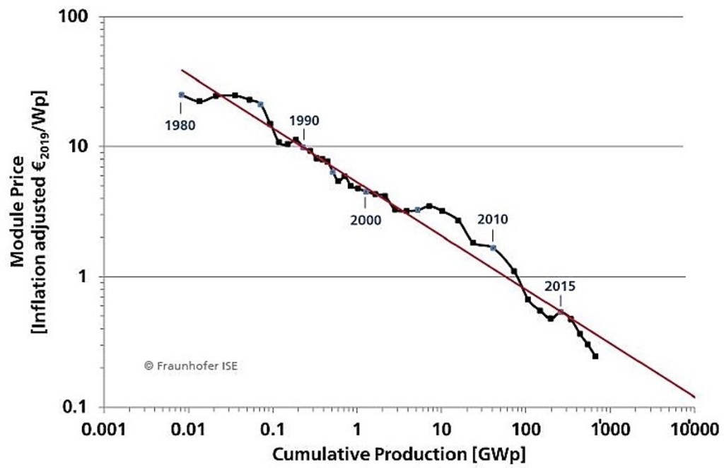Evolución del coste del vatio solar en los últimos cuarenta años. En la actualidad, el precio está por debajo de los 25 céntimos de euro
