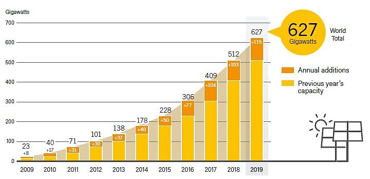 Históricamente, Estados Unidos fue el líder de la energía fotovoltaica instalada durante muchos años. Posteriormente, Japón se situó en primer lugar y mantuvo esa plaza desde finales de la década de 1990 hasta 2005, año en el que Alemania tomó la delantera, posición que mantuvo durante la siguiente década. En 2015, China superó a Alemania para convertirse en el mayor productor mundial de energía fotovoltaica y en 2017 se convirtió en el primer país en superar los 100 GW de capacidad instalada. A fines de 2019, la capacidad instalada acumulada global alcanzó 627 GW. La siguiente figura muestra la evolución de la potencia instalada en el planeta desde comienzos de la presente década: