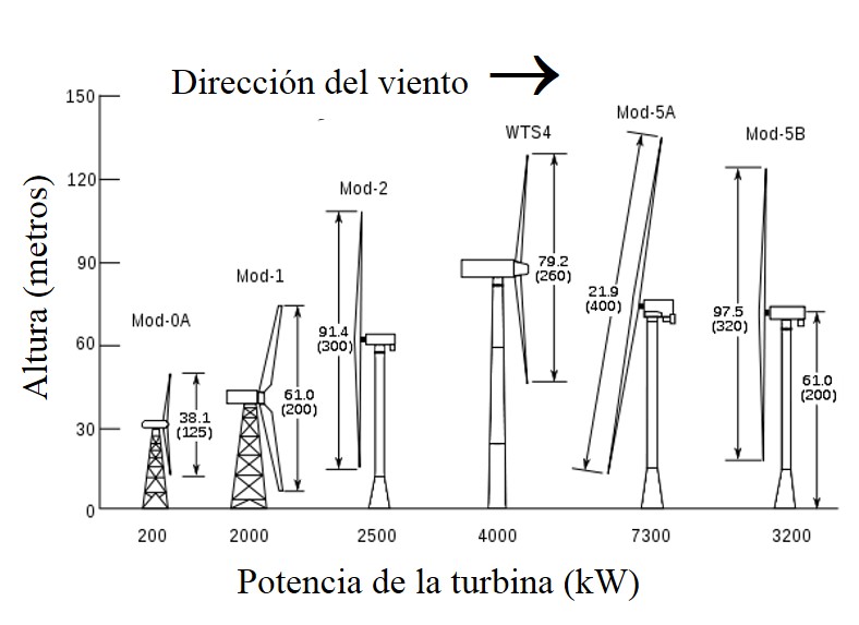 Las conocidas como “turbinas de la NASA”; la compañía Boeing jugó un papel determinante en el desarrollo de algunos modelos, como el Mod-2 y el Mod-5B. Fuente de la figura: adaptado de Wikipedia