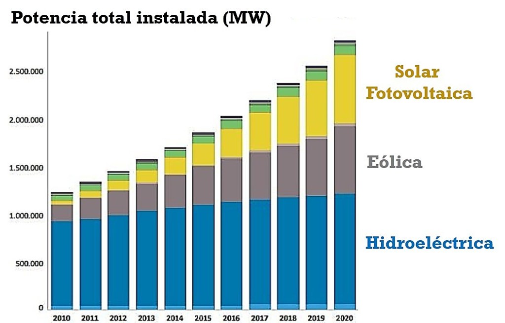 Datos de potencia instalada acumulada en el mundo a finales de 2020: Hidroeléctrica: 1.153 GW (1.133 en 2019); Eólica 733 GW (651 GW en 2019); Fotovoltaica: 707 GW (630 GW en 2019)