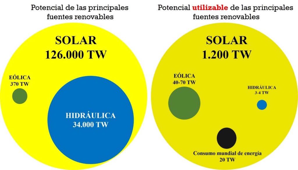 La magnitud de los principales recursos renovables se puede entender mejor con unos datos y una imagen:
