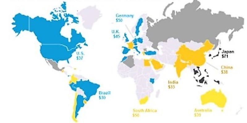 Las fuentes de obtención de energía eléctrica más barata en diversos países, según la tecnología de producción: en azul, eólica, en amarillo-naranja, fotovoltaica y en negro, carbón. Fuente: Jeremy Hodges, “Wind, Solar Are Cheapest Power Source In Most Places”. Bloomberg Green, 19-octubre-2020