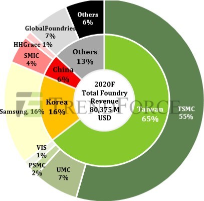 Reparto del mercado de los fabricantes “pure foundry” en el año 2020. El trozo de “tarta” que se lleva TSMC es el 55% del mercado mundial. Le siguen, de lejos, Samsung (16%, Corea del Sur), Global Foundries (7%, Estados Unidos) y United Microelectronics (7%, también de Taiwan)