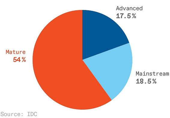 Capacidad instalada en el planeta según la tecnología de procesado de los chips. Mature: nodos de 40 nm o superiores, Advanced: nodos por debajo de 10 nm, Mainstream: nodos comprendidos entre 10 y 40nm