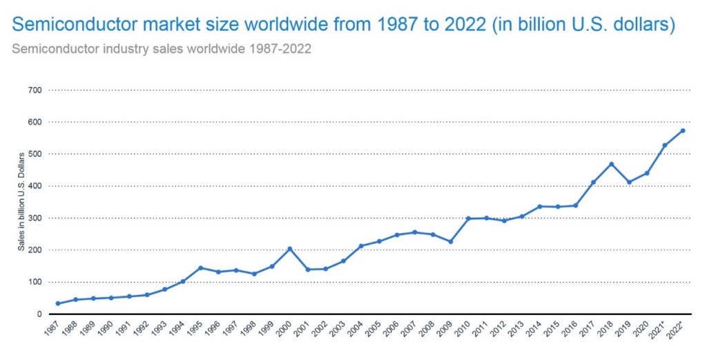 Facturación anual de la industria microelectrónica, expresada en miles de millones de dólares USA. Datos obtenidos en Statista.com