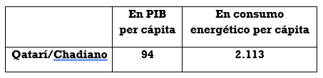 Las diferencias entre los ciudadanos más ricos del planeta y los más pobres son sencillamente clamorosas. En la siguiente Tabla se indican los cocientes para el PIB per cápita y para el consumo energético per cápita, dividiendo las cifras correspondientes a cada término de un qatarí promedio entre las de un ciudadano chadiano promedio. De acuerdo con la gráfica precedente, Qatar es el país de mayor riqueza en términos de PIB per cápita, así como de mayor consumo energético diario per cápita; Chad es el país de mayor pobreza energética per cápita del planeta: