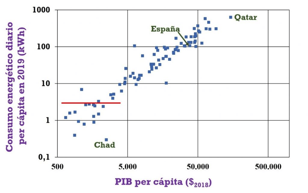 Las escalas de ambos ejes son logarítmicas. La línea roja indica un consumo energético de 3.5 kWh al día, que se considera el mínimo de subsistencia. Señalados en la gráfica están el país más pobre de la Tierra en términos de consumo energético (Chad), el más rico (Qatar) y España, que pertenece al club de lo que denomino primer mundo energético. Fuentes: Our World in Data para el consumo energético (2019) y Fondo Monetario Internacional para el PIB per cápita (2018).