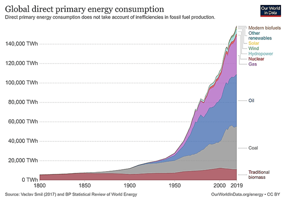 Energía consumida en el planeta (TWh) en los dos últimos siglos. Fuente de la imagen: Our World in Data