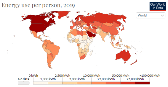 Consumo energético por persona durante 2019 en todos los países de la Tierra. Fuente de la imagen: Our World in Data