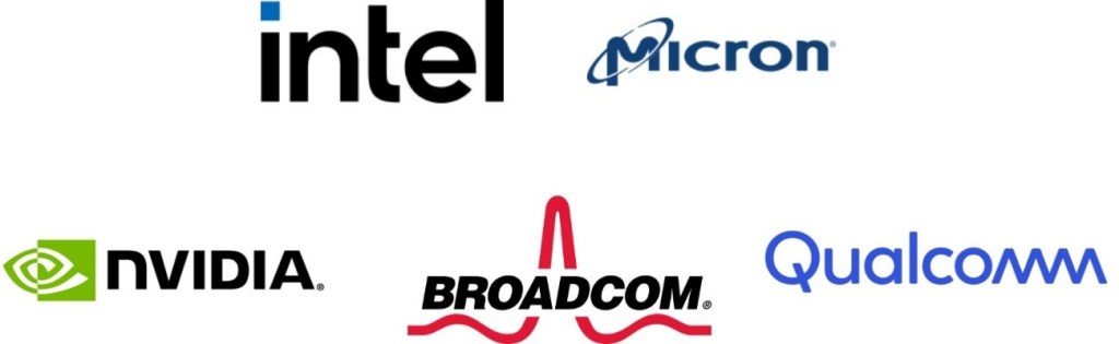 Los principales fabricantes estadounidenses. Arriba: principales fabricantes integrales de chips (Intel, Micron). Abajo: los tres grandes fabricantes que diseñan chips y contratan su fabricación a otros, principalmente a TSMC (Qualcomm, Broadcom, Nvidia)