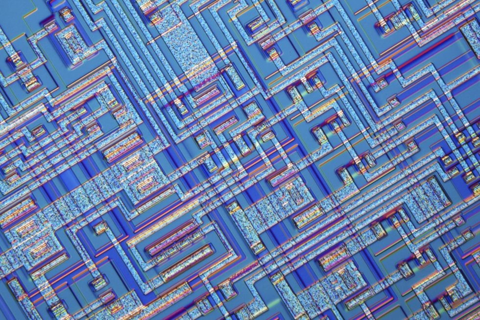 Imagen coloreada, tomada con un microscopio, de un CI. Lo que se ve son las pistas metálicas de interconexión de los transistores, que están debajo, no visibles.