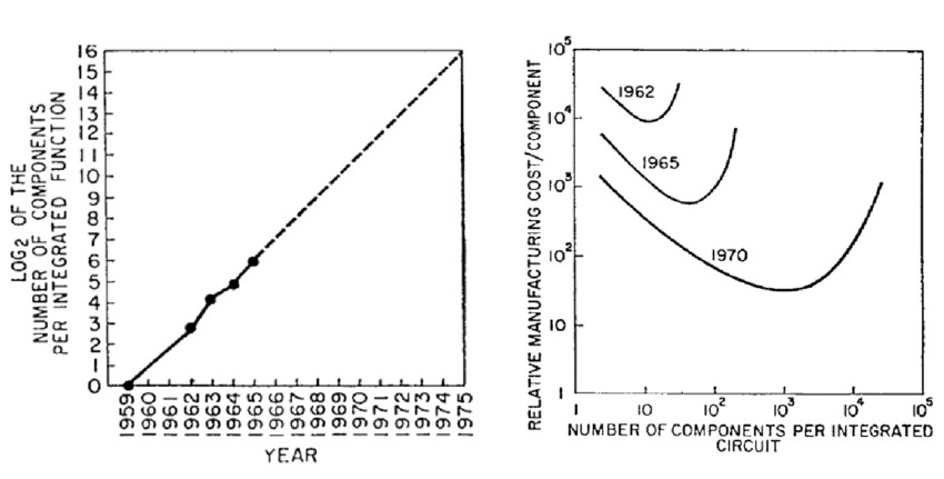 En 1965, Gordon Moore, uno de los fundadores de Intel, publicó un célebre artículo qué, con el paso de los años, se ha convertido en una especie de profecía: el número de transistores que se integran en un chip se duplica cado dos años [Moore, G., “Cramming more components onto integrated circuits”. Electronics Magazine, vol. 38, no. 8, (19-april-1965) pg. 114]. Ese artículo, una verdadera joya de la historia de la electrónica, es probablemente uno de los que más ha influido en el desarrollo posterior de esta rama de la ciencia y la tecnología. Se puede descargar libremente desde este enlace. La figura muestra lo que Moore incluyó en su célebre artículo: