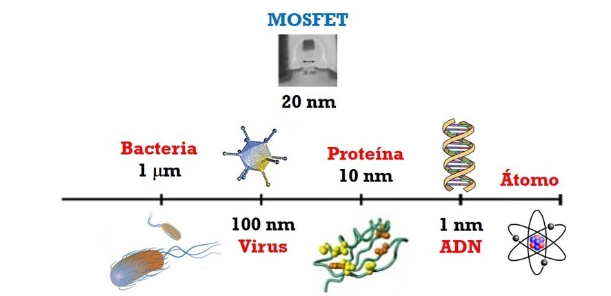 Comparando tamaños con la biología. Algunos dispositivos actuales son tan pequeños como una proteína o un virus