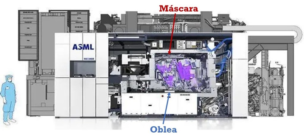 Un equipo de litografía UVE comercial, junto con un operario para hacerse una idea del tamaño. La fuente de radiación UVE está en la parte inferior derecha, transmitiendo la luz hacia el “noroeste” del equipo. Después de reflejarse en varios espejos, la luz incide sobre la máscara reflectante en la parte superior antes de llegar a la oblea a través de otro conjunto de espejos. Un carrusel situado en el lado izquierdo [no visible] mueve las obleas dentro y fuera del equipo. Las máscaras tienen una entrada independiente, en la parte superior