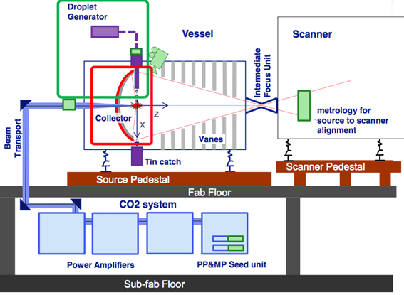 Esquema de una fuente de luz UVE, con varios de los subsistemas necesarios para su funcionamiento, entre los que destaca el láser de CO2 que golpea las gotitas de estaño, el espejo colector de la radiación UVE, etc.