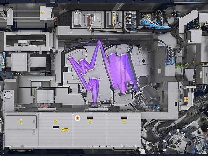Imagen del interior de una máquina de litografía UVE en la que se parecía el recorrido que hace la luz desde la fuente hasta la oblea
