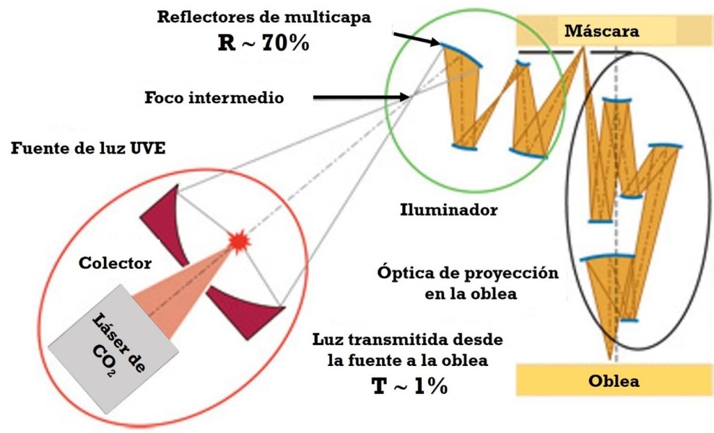 Esquema del tren óptico de un equipo UVE. Esta formado por el Colector (1 lente), el Iluminador (4 lentes), la Máscara (1 lente) y la Óptica de proyección (6 lentes). En conjunto, la luz UVE debe reflejarse en 12 lentes con una reflectividad del ~ 70% en cada una, lo que hace que a la oblea llegue ~1.4% de la luz generada en la fuente