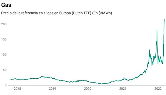Evolución del precio del MWh producido con gas desde 2018 al momento presente