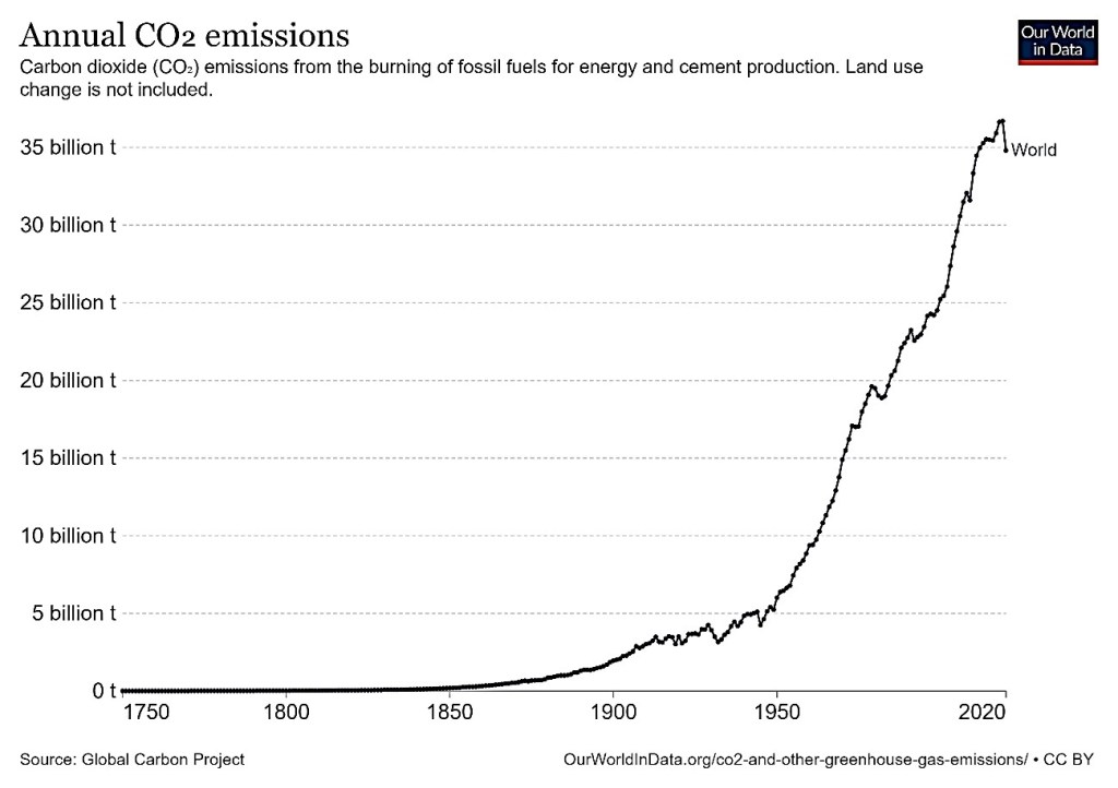 La quema de combustibles fósiles está detrás del aumento mostrado en la figura anterior. En efecto, las emisiones de CO2 no han hecho más que crecer ininiterrumpidamente, desde 23 Gt en 1995 (1 Gt = 1.000 millones de toneladas) a 35 Gt en 2021: