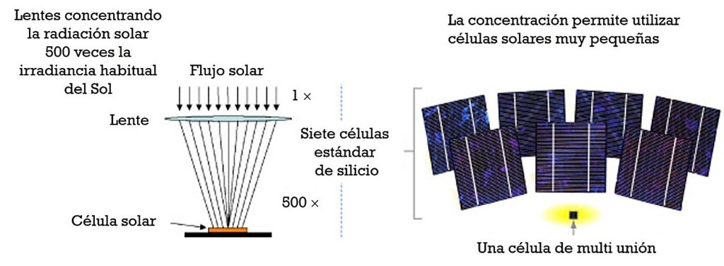 En esencia, un sistema de concentración es un equipo óptico integrado por lentes y espejos, mediante los que se concentra la luz del Sol en una célula de muy alta eficiencia y área muy reducida. Es decir, con los sistemas de concentración se substituyen materiales de alto coste (las células solares de multi-unión), por materiales de bajo coste (lentes y espejos). La siguiente figura muestra esquemáticamente el concepto de concentración y su utilidad: