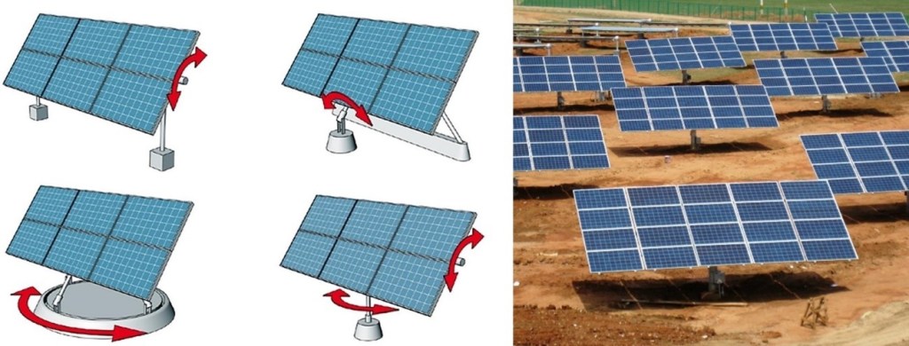 Izquierda: diversos sistemas de seguimiento del sol de uno o dos ejes. Derecha: Hueto solar con paneles fotovoltaicos dotados de un sistema de seguimiento de doble eje