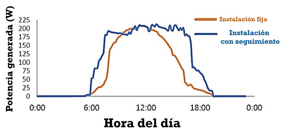 Aporte extra de energía en sistemas fotovoltaicos con seguimiento del Sol. Los beneficios se obtienen sobre todo a primera y a última hora del día