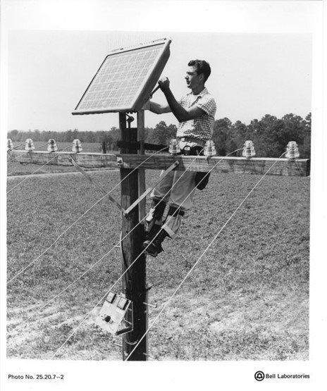 Figura 3. Publicidad de los Bell Telephone Laboratories del uso de células solares como fuente de energía de un sistema de comunicaciones telefónicas autónomo instalado en Americus, (Georgia, EE. UU.). La imagen muestra a un operario subido a un poste del cableado telefónico instalando un módulo fotovoltaico