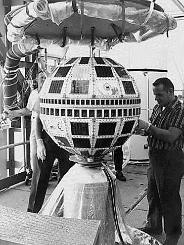 Figura 4. Satélite Vanguard-I, cuyo tamaño era similar al de una pelota de fútbol. Las células solares que suministraban la energía del satélite están distribuidas por toda su superficie. Los operarios de la imagen están instalando el satélite en el cohete que lo lanzó al espacio el 17-marzo-1958. Fuente de la imagen: The Editors of Encyclopedia Britannica “Vanguard satellite”, 20-julio-1998